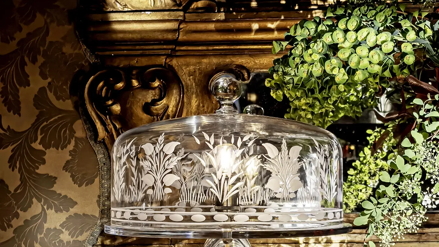 Artful and inspiring, the Cake Lamp is handmade in Italy from hand-etched crystal. Launched at l’Appartamento by Artemest during Milano Design Week 2024, it has a single vertically positioned bulb to cast even light from the center. When illuminated, the top comes to life, warming the room with soft light and playful shadows. The functional top is also removable so objects and precious treats can be uniquely displayed on the flat plate within a dome of light.