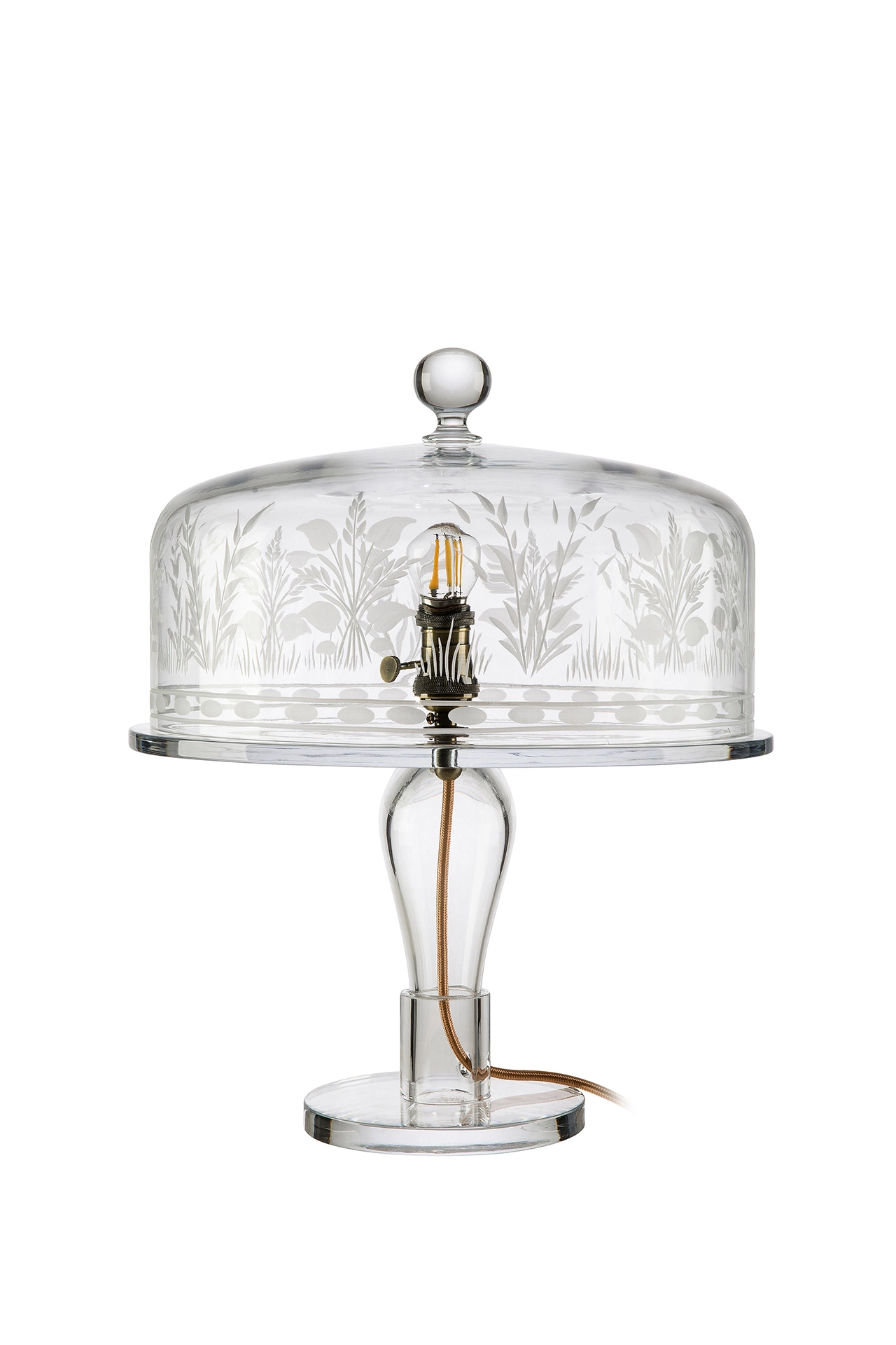 Artful and inspiring, the Cake Lamp is handmade in Italy from hand-etched crystal. Launched at l’Appartamento by Artemest during Milano Design Week 2024, it has a single vertically positioned bulb to cast even light from the center. When illuminated, the top comes to life, warming the room with soft light and playful shadows. The functional top is also removable so objects and precious treats can be uniquely displayed on the flat plate within a dome of light.