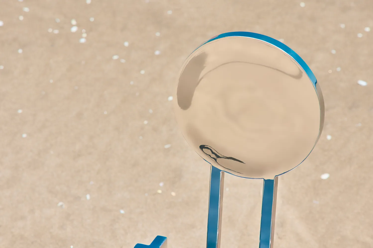 Its sculptural silhouette and reflective finish make it both a decorative and functional object, capable of transforming the perception of the space it occupies.