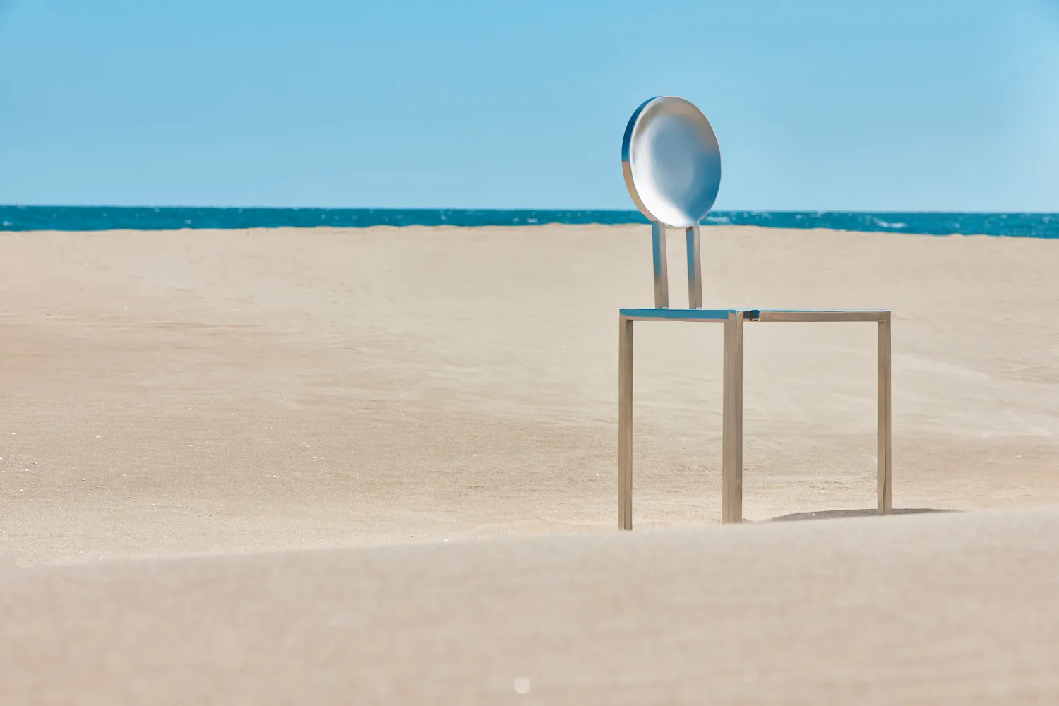 Contemporary and distinctive, it stands out through a strong visual identity, balancing formal precision with conceptual depth. Geometric form and optical illusion the structure of the MIROIR chair is based on perfectly aligned symmetry: a square seat measuring 34 x 34 cm is paired with a circular backrest 25 cm in diameter, both connected by polished mirror-finish stainless steel tubes. This highly reflective material interacts with its surroundings, producing visual echoes and engaging with architectural lines to create an immersive spatial effect. The mirrored finish allows for a dual reading of the object — at once functional furniture and reflective sculpture — blurring the line between design and art.