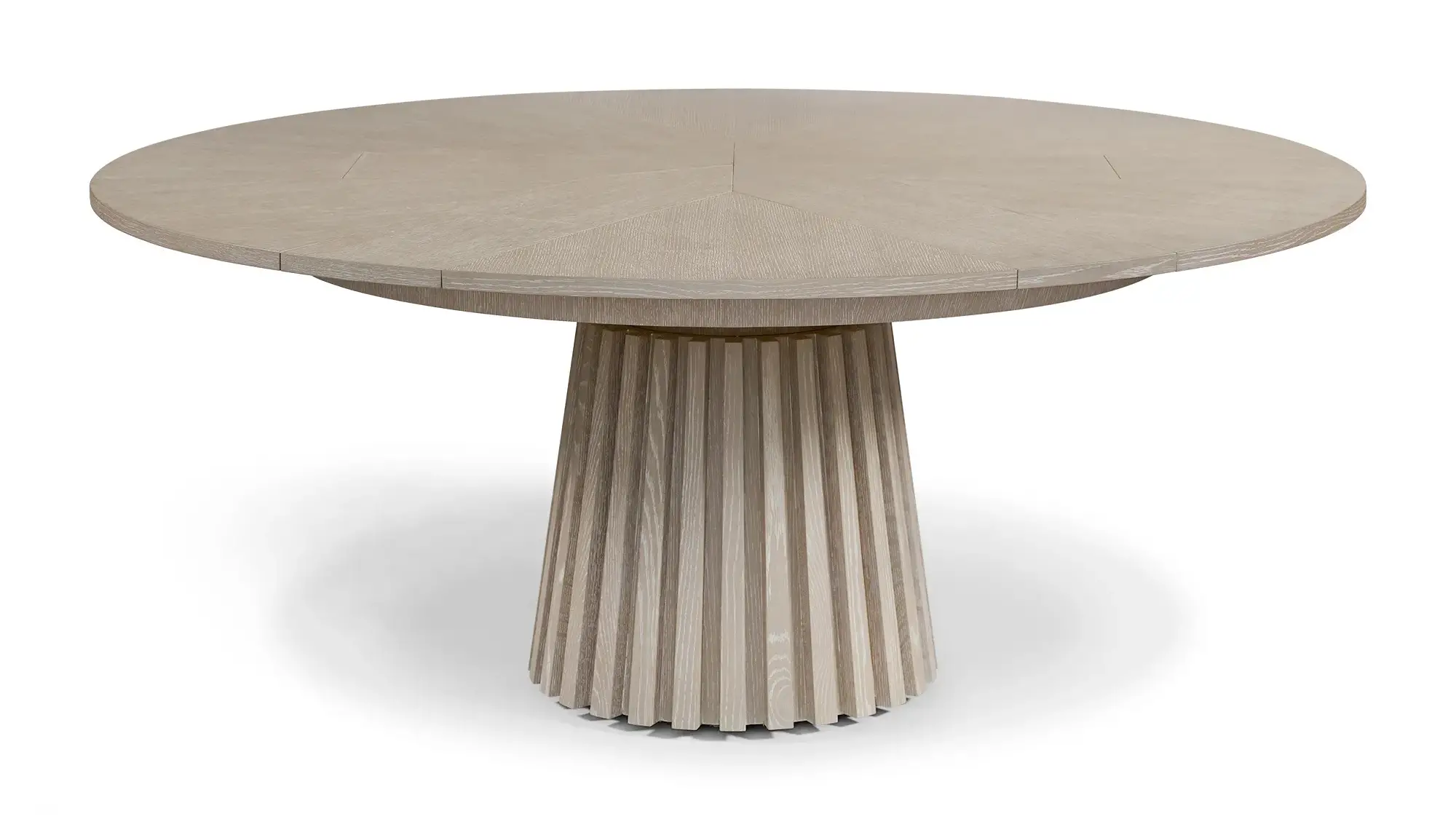 Crafted entirely of French white oak, this table builds-on and utilizes 17th Century European ingenuity developed to expand any table into the ultimate accommodation for additional guests paired with its simplistic pedestal base and starburst top design.