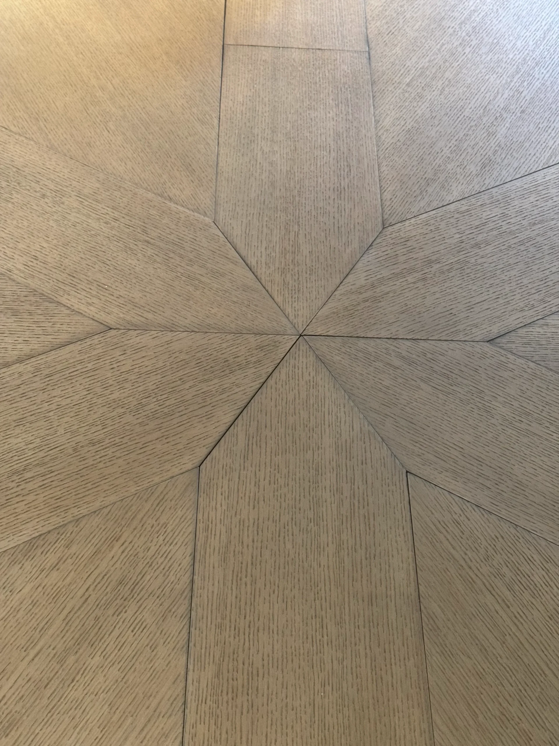 Crafted entirely of French white oak, this table builds-on and utilizes 17th Century European ingenuity developed to expand any table into the ultimate accommodation for additional guests paired with its simplistic pedestal base and starburst top design.